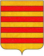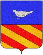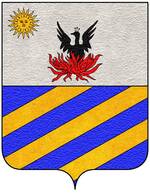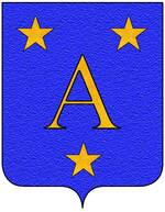 (FR) Écartelé aux 1 et 4 d'argent à cinq fasces ondées de sable aux 2 et 3 à un A majuscule d'or l'écu entouré d'une filière dentelée de gueules | |