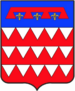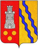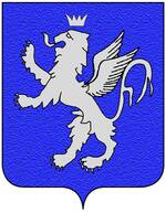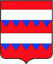 (FR) De gueules à la fasce ondée d'argent en pointe surmontée de deux lions affrontés d'or couronnés du même acc d'un pain arrondi au naturel posé entre leurs pattes | |