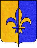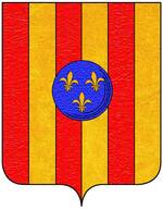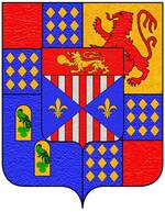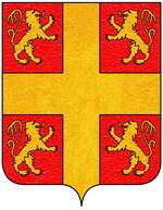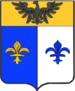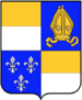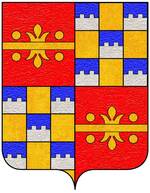 (FR) Écartelé au 1 d'or à l'aigle de sable couronnée du champ au 2 de gueules à une couronne à l'antique d'or au 3 tranché de sable sur argent à trois fleurs-de-lis de l'un à l'autre 1 en chef et 2 en pointe et une bande bretessée à plomb d'or brochant sur le tranché au 4 d'azur à une fleur-de-lis d'argent | |
