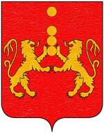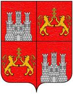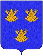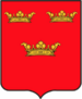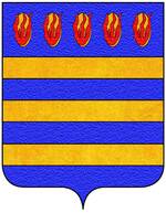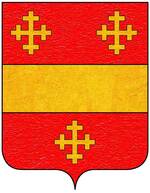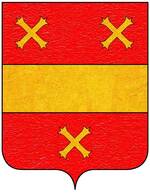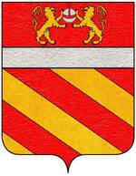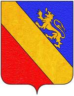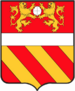 (FR) De gueules à deux lions affrontés acc de trois pains arrondis rangés en pal 2 entre les pattes desdits lions et 1 en chef le tout d'or | |