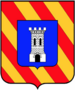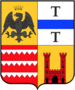 (IT) Inquartato, al 1° e 4° di rosso, a tre fasce d’argento, a foglia di sega, al 2° e 3° d’oro, al castello di rosso, mattonato, aperto e finestrato di nero, il tutto sotto un capo d’oro, carico di un’aquila coronata, di nero | |