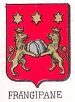 | Frangipani (LAZ) (Roma) (IT) bandato di rosso, e d'oro, col capo di rosso, sostenuto da una divisa d'argento, caricato di die leoni d'oro. contra-rampanti. e tenenti fra le zampe un globo d'argento, crociato di rosso, ovvero un pane d'argento, quasi in atto di frangerlo con le branche | |