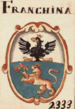 | Franzina (XXX) (xxx) (IT) inquartato; nel 1° d’oro all’aquila di nero col volo abbassato, coronata all’antica del campo; nel 4° d’oro al castello di rosso torricellato di due pezzi, merlato alla guelfa, aperto e finestrato di nero; nel 2° d’argento alla fascia d’azzurro, accompagnata da due lettere capitali latine di nero «T», una sopra, l’altra sotto; nel 3° di rosso a tre foglie di sega d’argento (citato in AIAR) | |