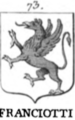| Franzoni (LIG) (Genova) (DE) Rechter Schild: Silber-rot spitzenförmig schräggeteilt und nach links verschoben, das Ganze überdeckt von 1 goldenen Schrägbalken Linker Schild: Rot-silber spitzenförmig geteilt und überdeckt von 1 goldenen Schrägbalken (citato in KHIF) | |
