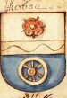 Kobau (LAZ) (Roma) (IT) troncato: nel primo d'argento, alla rosa di rosso, bottonata d'oro e fogliata di verde; nel secondo d'azzurro, alla ruota a sei raggi d'argento, alla fascia d'oro, caricata da una burella ondata di nero, attraversante sulla partizione (citato in GLMB n. 811) |