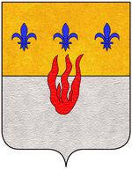 (IT) Troncato, d'oro, a tre gigli d'azzurro, ordinati in fascia, e d'argento, con la fiamma di rosso, in cuore, attraversante | |