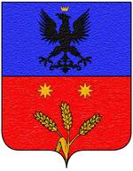 (IT) troncato; nel 1° d'azzurro, alla rosa d'oro; nel 2° di rosso, alla rosa d'argento; alla fascia d'argento, carica di due spighe di orzo d'oro decussate, sulla troncatura | |