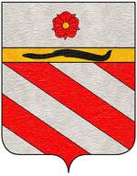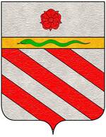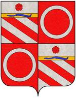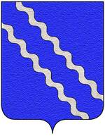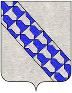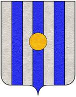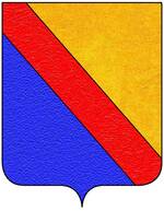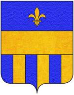 (FR) Coupé au 1 de gueules au pal d'azur penché en bande et ch de trois croissants montants d'or les cornes dirigées vers le canton dextre du chef chaque croissant surmonté d'une étoile d'or au 2 d'azur à deux fasces ondées d'argent | |