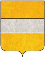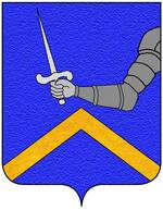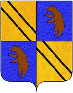 (FR) D'azur à un ours passant de sable colleté d'or en coeur de l'écu entre deux fasces d'or la première haussée l'autre abaissée | |