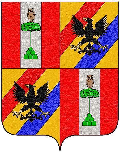 Inquartato: nel primo e nel quarto, di rosso al palo d’argento caricato di un monte di sei cime di verde, cimato da un pino dello stesso, sostenente una civetta al naturale posta di fronte: nel secondo e nel terzo, d’oro a due sbarre di rosso e d’azzurro, il tutto caricato di un'aquila di nero imbeccata e membrata d’oro