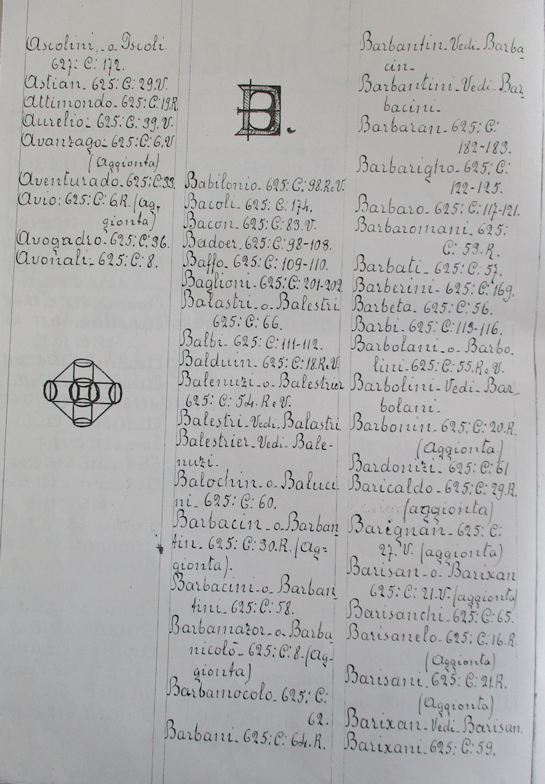 Pagina 02 del Repertorio generale alfabetico delle famiglie dei manoscritti 625-629