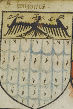 | attuale | 20:47, 22 mar 2021 | 239 × 355 (201 KB) | Massimop (discussione | contributi) | Stemma della famiglia De Benzonis<br/> L'immagine è tratta dal manoscritto 1390 (Codice Trivulziano) custodito nella Biblioteca Trivulziana (https://trivulziana.milanocastello.it/). Il Comune di Milano, titolare dei diritti dell'opera, ne ha esplicitamente autorizzato la pubblicazione su questo sito con il vincolo dell'uso non commerciale delle immagini ed il divieto della loro successiva ridistribuzione. Ogni richiesta relativa all'uso di tali immagini deve essere inoltrata direttamente all'... |
