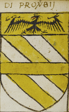 | attuale | 17:35, 4 apr 2021 | 229 × 369 (197 KB) | Massimop (discussione | contributi) | Stemma della famiglia Di Proverbi<br/> L'immagine è tratta dal manoscritto 1390 (Codice Trivulziano) custodito nella Biblioteca Trivulziana (https://trivulziana.milanocastello.it/). Il Comune di Milano, titolare dei diritti dell'opera, ne ha esplicitamente autorizzato la pubblicazione su questo sito con il vincolo dell'uso non commerciale delle immagini ed il divieto della loro successiva ridistribuzione. Ogni richiesta relativa all'uso di tali immagini deve essere inoltrata direttamente all'... |