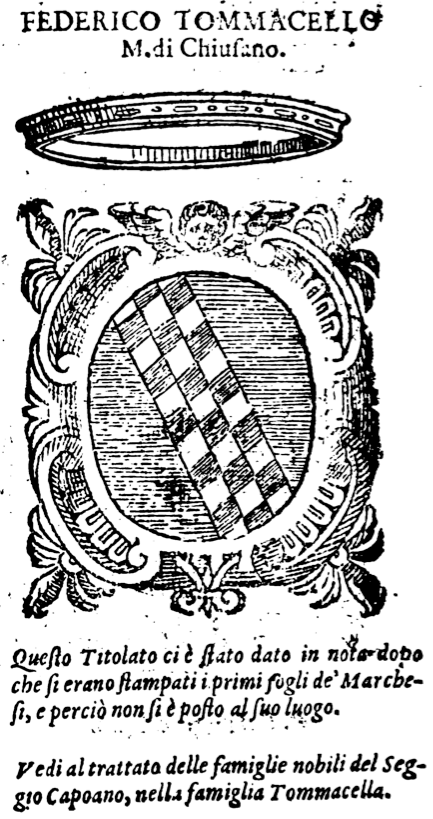 | attuale | 22:32, 31 gen 2022 | 433 × 819 (272 KB) | Massimop (discussione | contributi) | Stemma della famiglia Tommacello <br/> Licenza Creative Commons Attribuzione - Non commerciale - Non opere derivate 3.0 Unported '''(cc by-nc-nd 3.0 IT)''' (vedi Armoriale:Copyright)<br/> L'immagine è tratta dal volume Descrittione del Regno di Napoli, di Scipione MAZZELLA, Napoli, 1586 Categoria:Immagini degli stemmi tratti dalla Descrittione del Regno di Napoli |